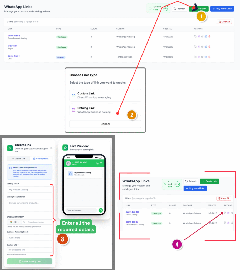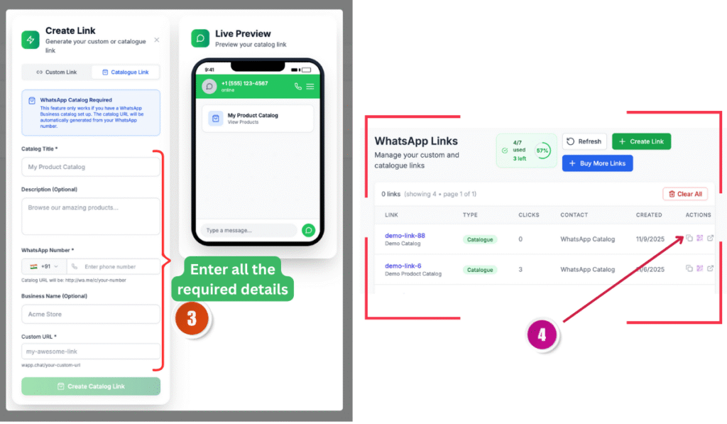 After entering all details, click Create Catalog Link. WappChat instantly generates your link and displays it on the dashboard. You can also copy it, test it, or download the QR code right away.