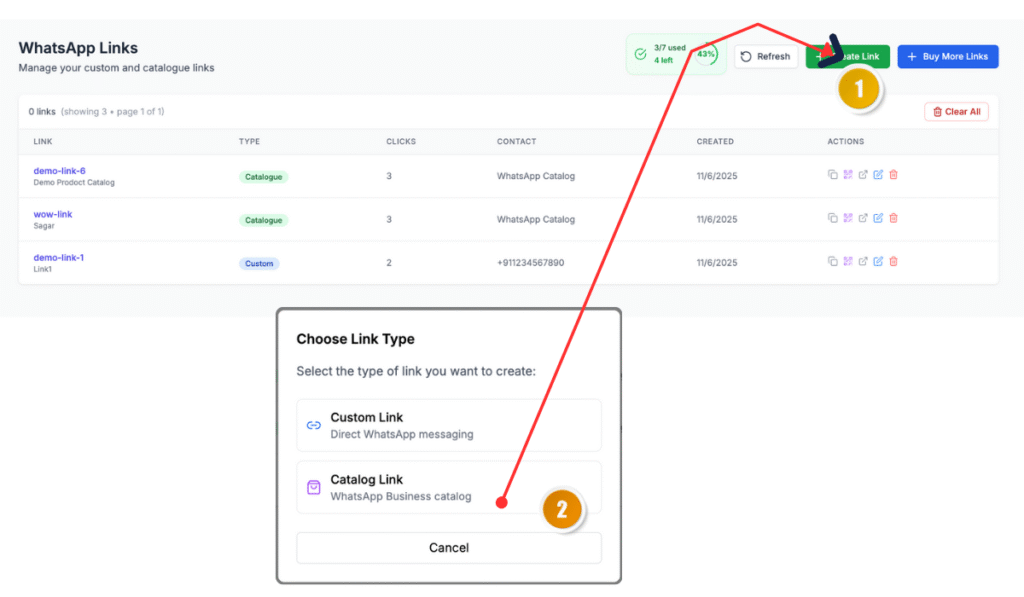 A pop-up appears asking you to select a link type. Choose Catalog Link. This option connects your WhatsApp Business catalog to your custom short link.
