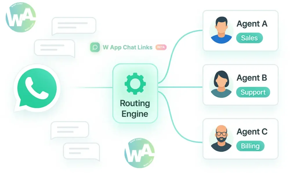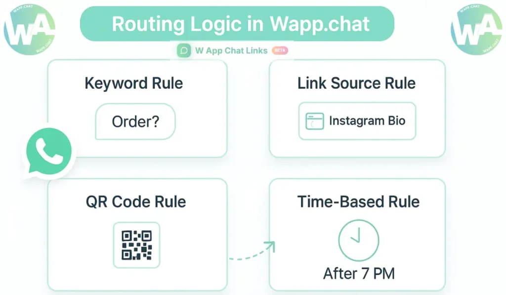 You may set rules for keywords, time of day, campaign links, or even QR scans from a store. Once the message reaches Wapp.chat, the system identifies the category and assigns an agent within that group.