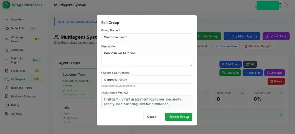 The Multiagent system in WApp.Chat Pro lets you create agent groups and distribute chats automatically among them. It works using intelligent assignment, balancing load, checking availability, and making sure distribution is fair. Customers don't need to know which agent they are contacting, the system handles everything in the background.